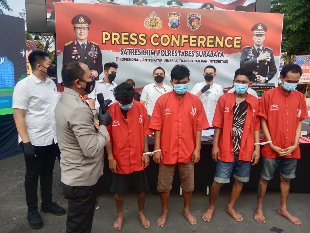 Empat tersangka yang berinisial JMH, 21 tahun alamat Putat Gede Timur Surabaya, LE, 22 tahun alamat Kupang Gunung Surabaya TS, 23 tahun alamat Wonokitri Surabaya dan WMP 23 tahun.