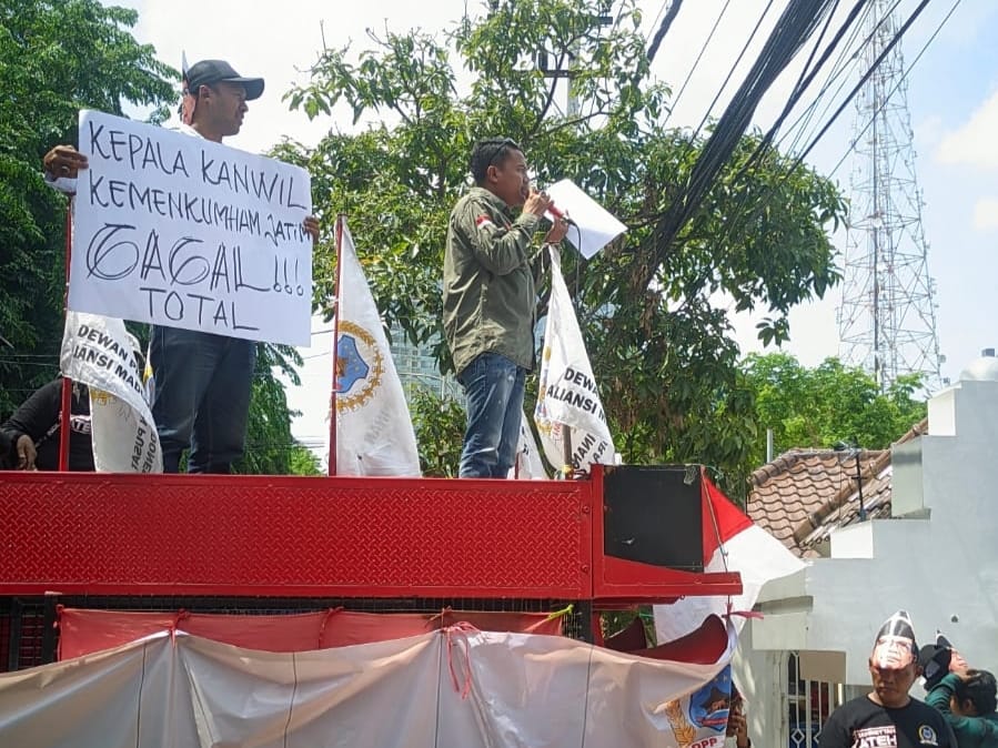Kata-kata itulah yang diteriakkan oleh Aliansi Madura Indonesia (AMI) saat menggelar aksi demonstrasi di kantor Kemenkumham Jatim pada selasa 9 Januari 2024.