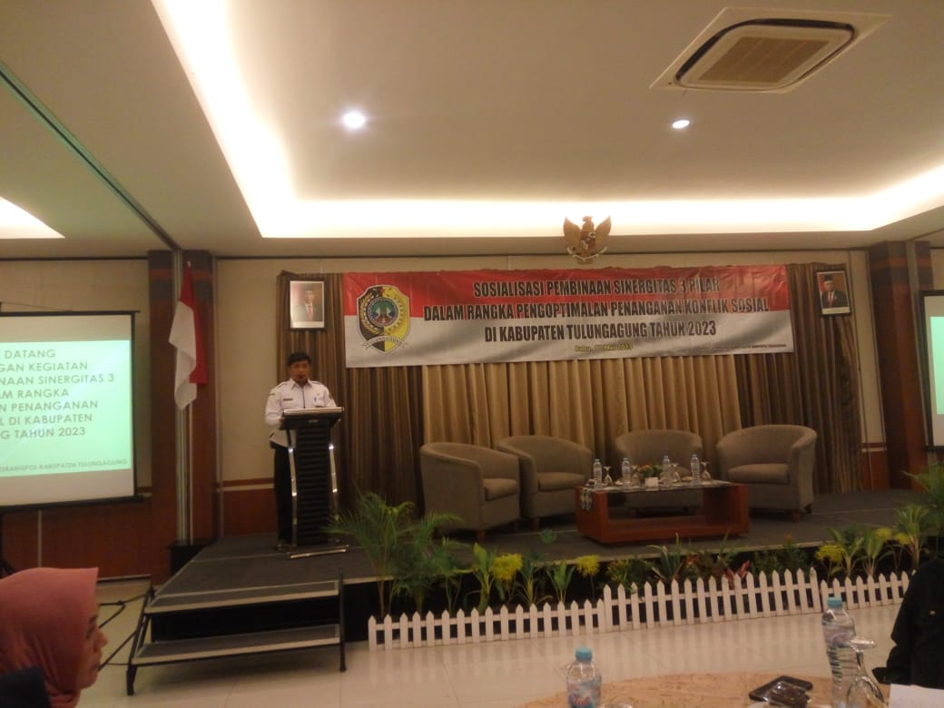 Brilian°Tulungagung – Dalam rangka mewujudkan Kamtibmas yang aman dan kondusif, Kantor Badan Kesatuan Bangsa dan Politik (Bakesbangpol) Kabupaten Tulungagung menyelenggarakan sosialisasi untuk membangun sinergi antara tiga pilar dalam upaya mengoptimalkan penanganan konflik sosial di wilayah kabupaten ini pada tahun 2023. Kegiatan ini dilaksanakan pada Rabu (17/05/2023) di gedung pertemuan Hotel Lojika.