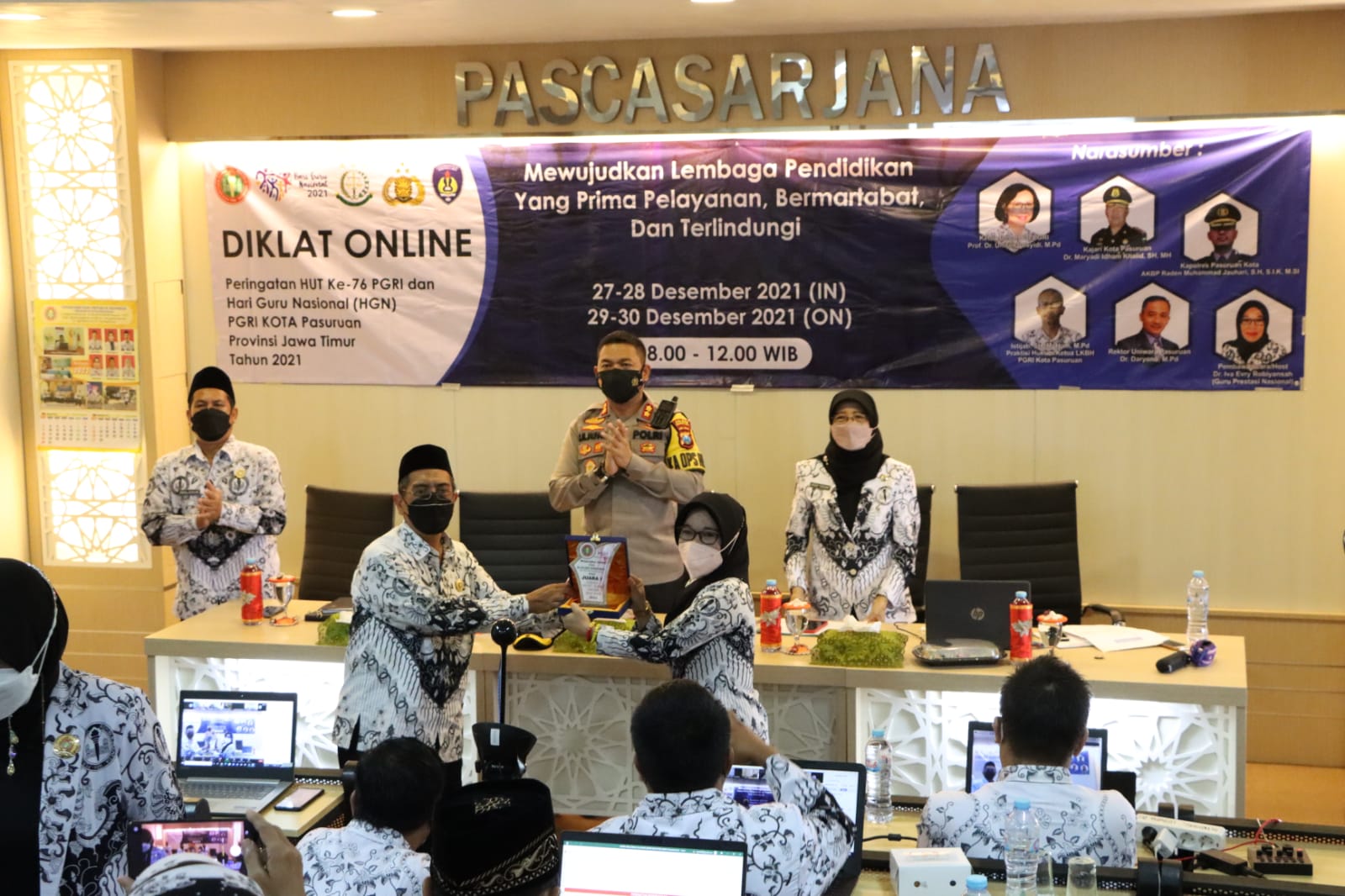 Brilian°Pasuruan – Kapolres Pasuruan Kota AKBP R.M Jauhari S.H S.I.K M.SI menghadiri kegiatan Diklat Online dalam rangka memperingati HUT PGRI Ke-76 dan Hari Guru Nasional Kota Pasuruan Provinsi Jawa Timur Tahun 2021 dengan tema “Mewujudkan Lembaga Pendidikan Yang Prima Pelayanan, Bermartabat dan Terlindungi” bertempat di Gedung Pascasarjana Universitas Wiranegara Jl. Ki Hajar Dewantara Kel. Tembokrejo Kec. Purworejo Kota Pasuruan.