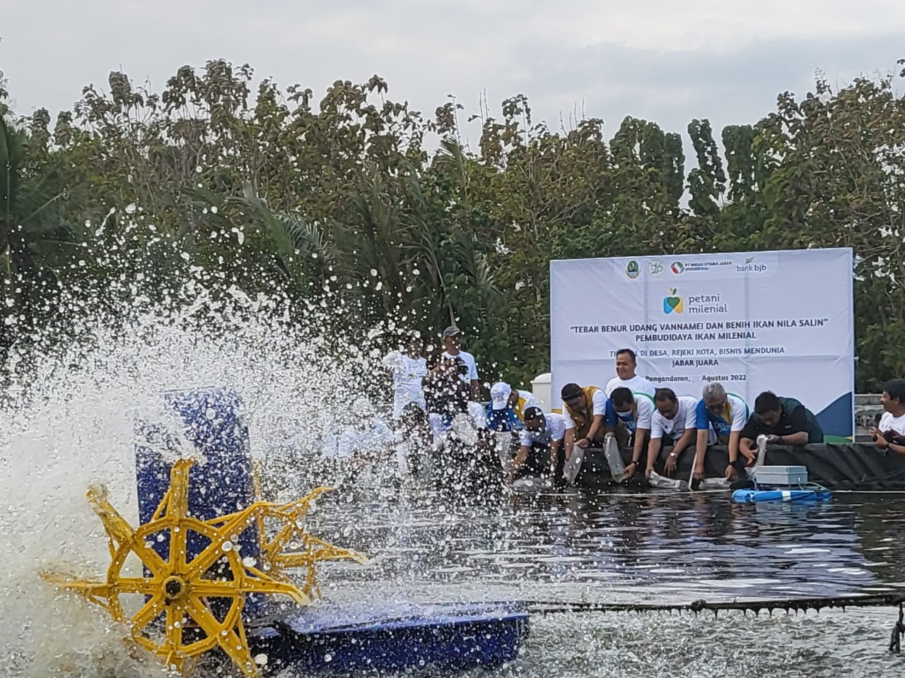 Brilian•Pangandaran – bank bjb bersama Wakil Gubernur Jawa Barat Uu Ruzhanul Ulum menebar benih udang Vaname di UPTD Perikanan Air Payau dan Laut Wilayah Selatan Jawa Barat, Minggu 28 Agustus 2022. Area tersebut dinamai Tambak Milenial Juara yang dikelola oleh para Petani Milenial Kabupaten Pangandaran.