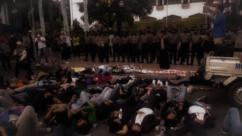 Pasca menyampaikan pesan kepada Kapolda Jatim, BEM Madura Raya lantas menabur bunga dan melakukan sedikit aksi teatrikal dengan cara menabur bunga sebagai tanda matinya rasa keadilan.