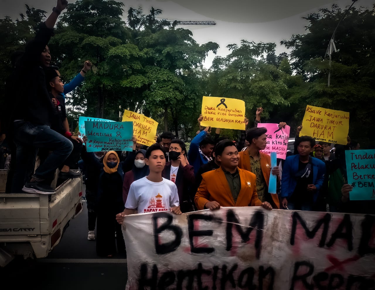 Aksi pertama, mereka menuju ke Polda Jatim dengan agenda tuntutan meminta kepada Kapolda, bahwasanya oknum yang sudah melakukan pemukulan terhadap sejumlah mahasiswa prosesnya sudah sejauh mana.