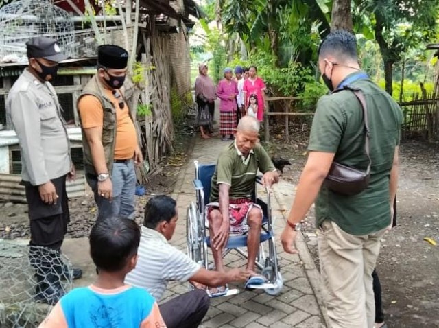 Kamis sore (3/2/2022) sekitar pukul 16.30 wib, Bripka Pujiono Bhabinkamtibmas Polsek Mlandingan yang bertugas di Selomukti bersama Ketua Peradin (Persatuan Advokat Indonesia) Pasuruan Sueb Efendi, SH dan Tim selaku donatur memberikan bantuan kursi roda kepada kakek Parto.