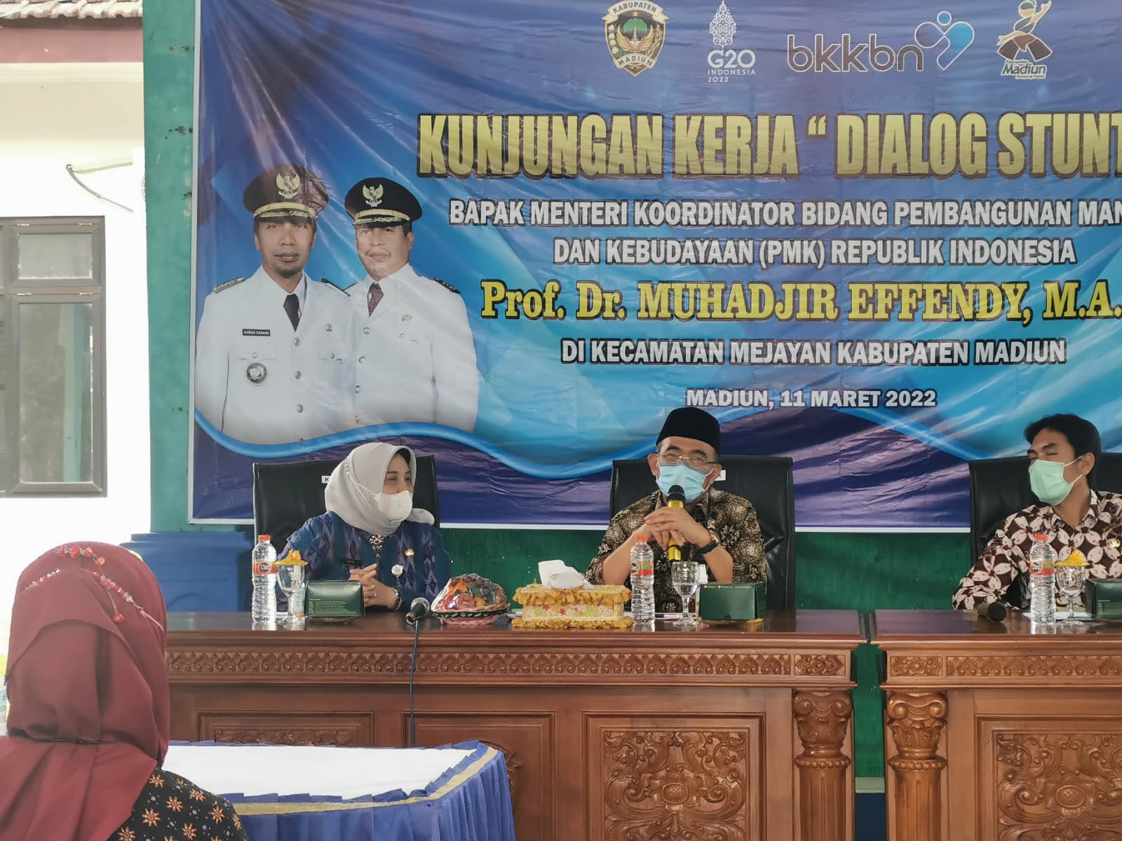 Brilian°Madiun – Kunjungan Kerja Menko PMK, Mujahir Efendy ke Kecamatan Mejayan, Kabupaten Madiun melakukan dialog bersama Bupati Madiun Ahmad Dawami dan Tim Pendamping Stunting wilayah Kabupaten Madiun yang didampingi oleh Kepala Perwakilan BKKBN Provinsi Jawa Timur, Maria Ernawati Jumat, (11/3/2022).