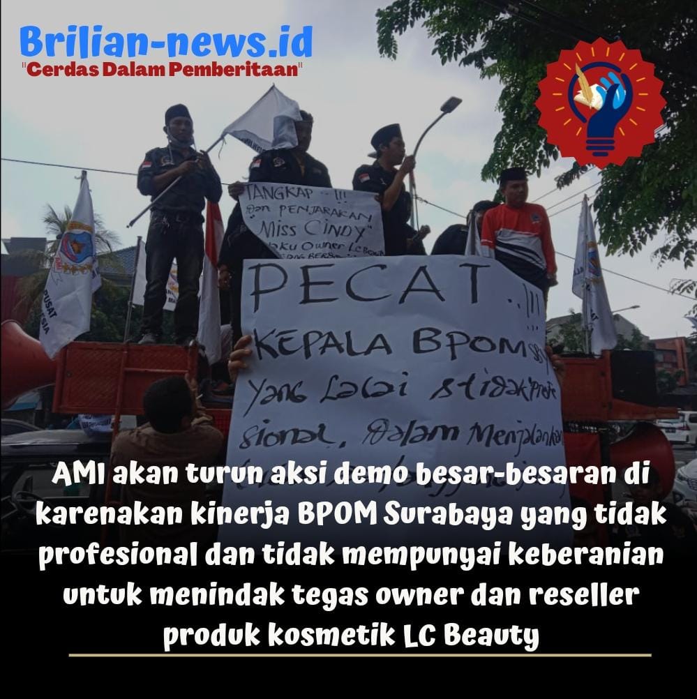 AMI akan turun aksi demo besar-besaran di karenakan kinerja BPOM Surabaya yang tidak profesional dan tidak mempunyai keberanian untuk menindak tegas owner dan reseller produk kosmetik LC Beauty yang tidak mempunyai ijin edar dan mengandung mercury, dan hal tersebut sangat membahayakan para penggunanya.