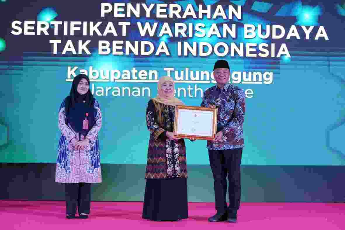 Brilian°Tulungagung – Bupati Tulungagung, H. Gatut Sunu Wibowo, SE ME, menerima penghargaan atas penetapan Jaranan Senterewe sebagai Warisan Budaya Tak Benda (WBTB) Indonesia.