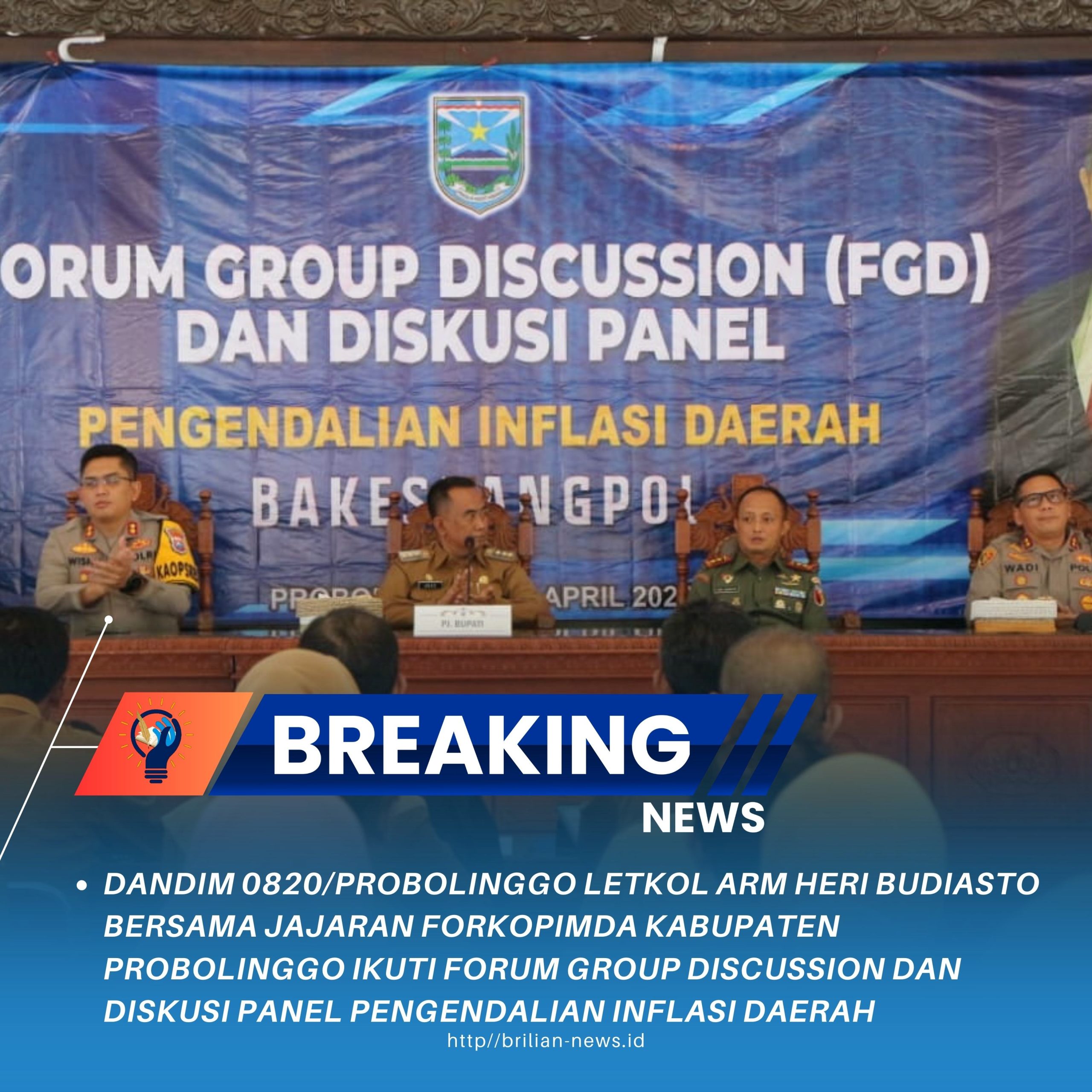 Probolinggo | Brilian-news.id-Komandan Kodim (Dandim) 0820/Probolinggo Letkol Arm Heri Budiasto bersama jajaran forum koordinasi pimpinan daerah (forkopimda) Kabupaten Probolinggo hadir bersama dalam kegiatan forum group discussion (FGD) dan diskusi panel pengendalian inflasi daerah, Selasa (2/4).