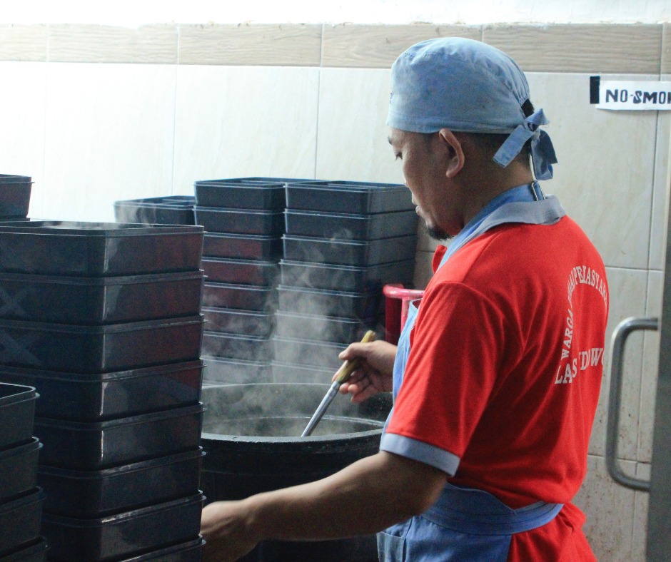 Pengawasan terhadap proses pengolahan dan pendistribusian makanan dilakukan secara rutin. Petugas memastikan porsi yang diberikan sesuai ketentuan dan menu yang disajikan sama dengan daftar menu yang telah ditetapkan dalam siklus.