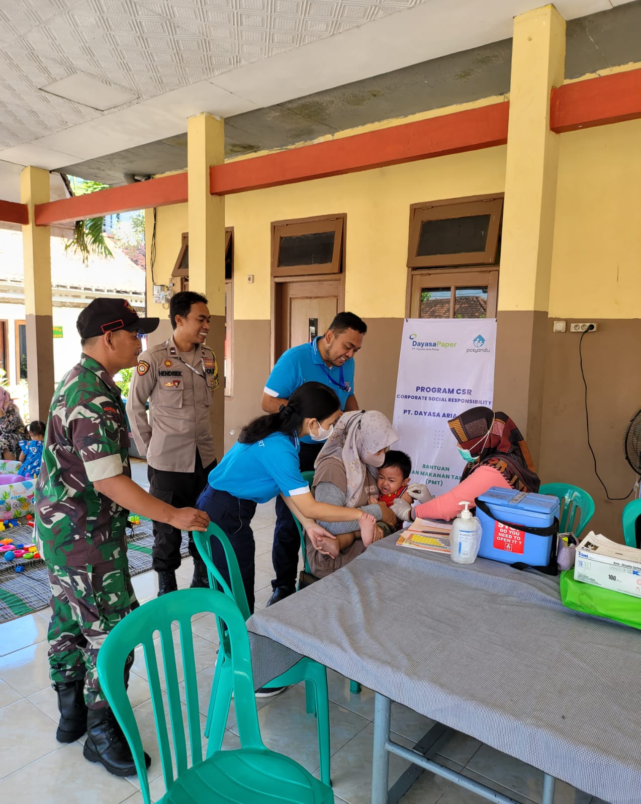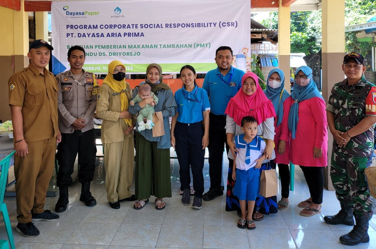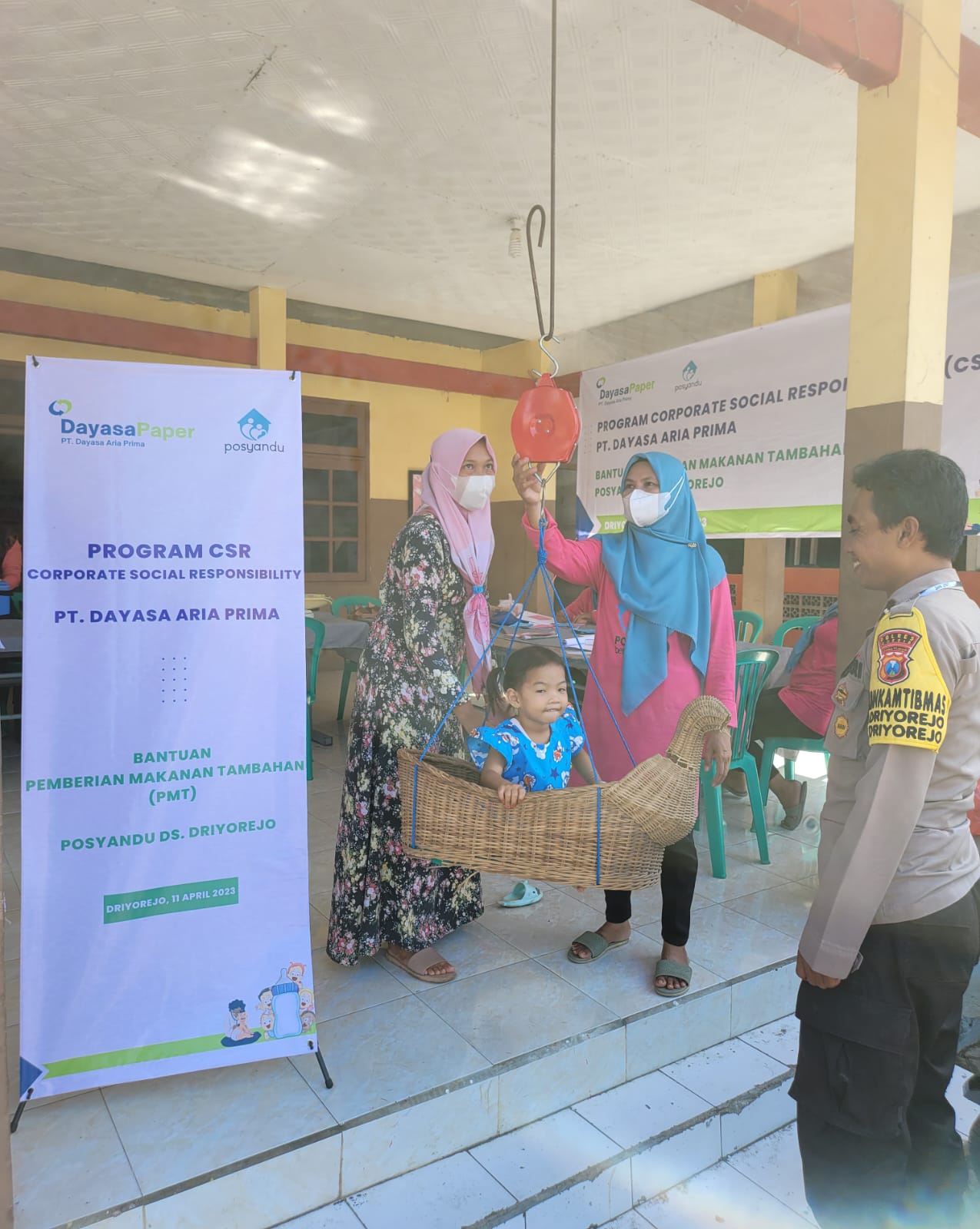 Brilian°Driyorejo, April 2023 – PT Dayasa Aria Prima, Produsen kertas kemasan yang beralamat di kawasan Driyorejo – Kab. Gresik, terus melaksanakan kegiatan sosial sebagai bentuk tanggung jawab sosial perusahaan (CSR). Dalam kesempatan ini PT. Dayasa Aria Prima memberikan bantuan berupa pemberian makanan tambahan (PMT) di Posyandu Desa Driyorejo yang dilaksanakan pada hari Selasa – 11 April 2023. Kegiatan ini dilaksanakan untuk membantu balita dan anak – anak khususnya yang bermukim di sekitar perusahaan agar selalu mendapatkan pelayanan kesehatan yang cukup. Kegiatan CSR ini berkolaborasi dengan tenaga Bidan setempat.