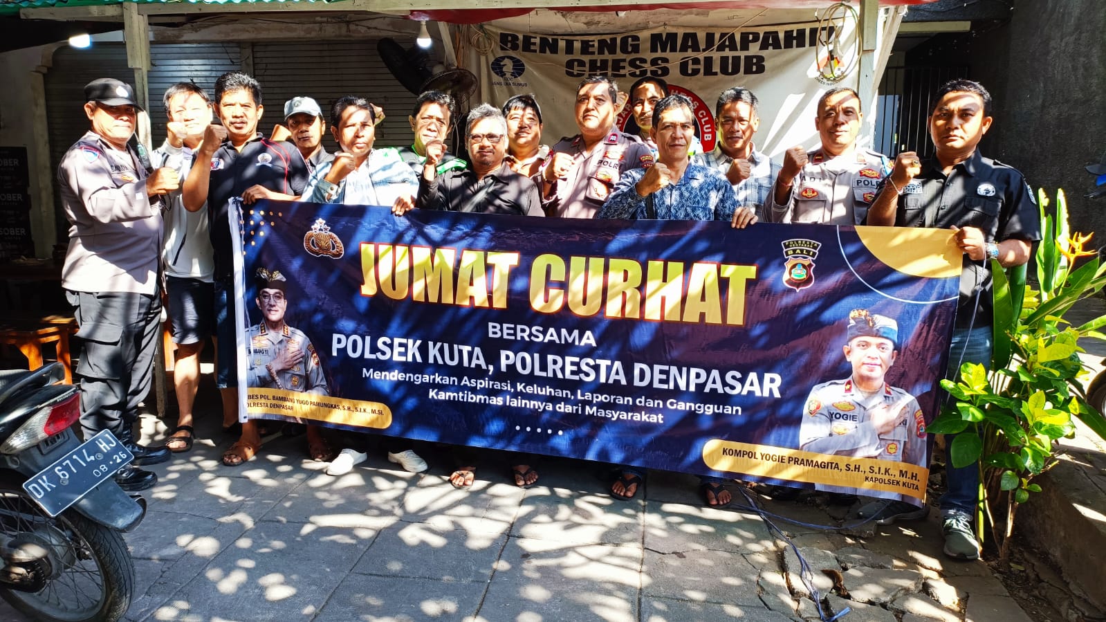 Bersama Komunitas Catur Benteng Majapahit Chess Club, Kapolsek Kuta Kompol Yogie Pramagita, S.H., S.I.K., M.H., yang diwakili oleh Iptu Bambang Setyanto, S.H., jabatan Kanit Intelkam dengan didampingi PJU dan Bhabinkamtibmas Kelurahan hadir dalam program Jumat Curhat yang bertempat di Posko jalan Majapahit Kuta Badung, Jumat pagi (23/06/2023).