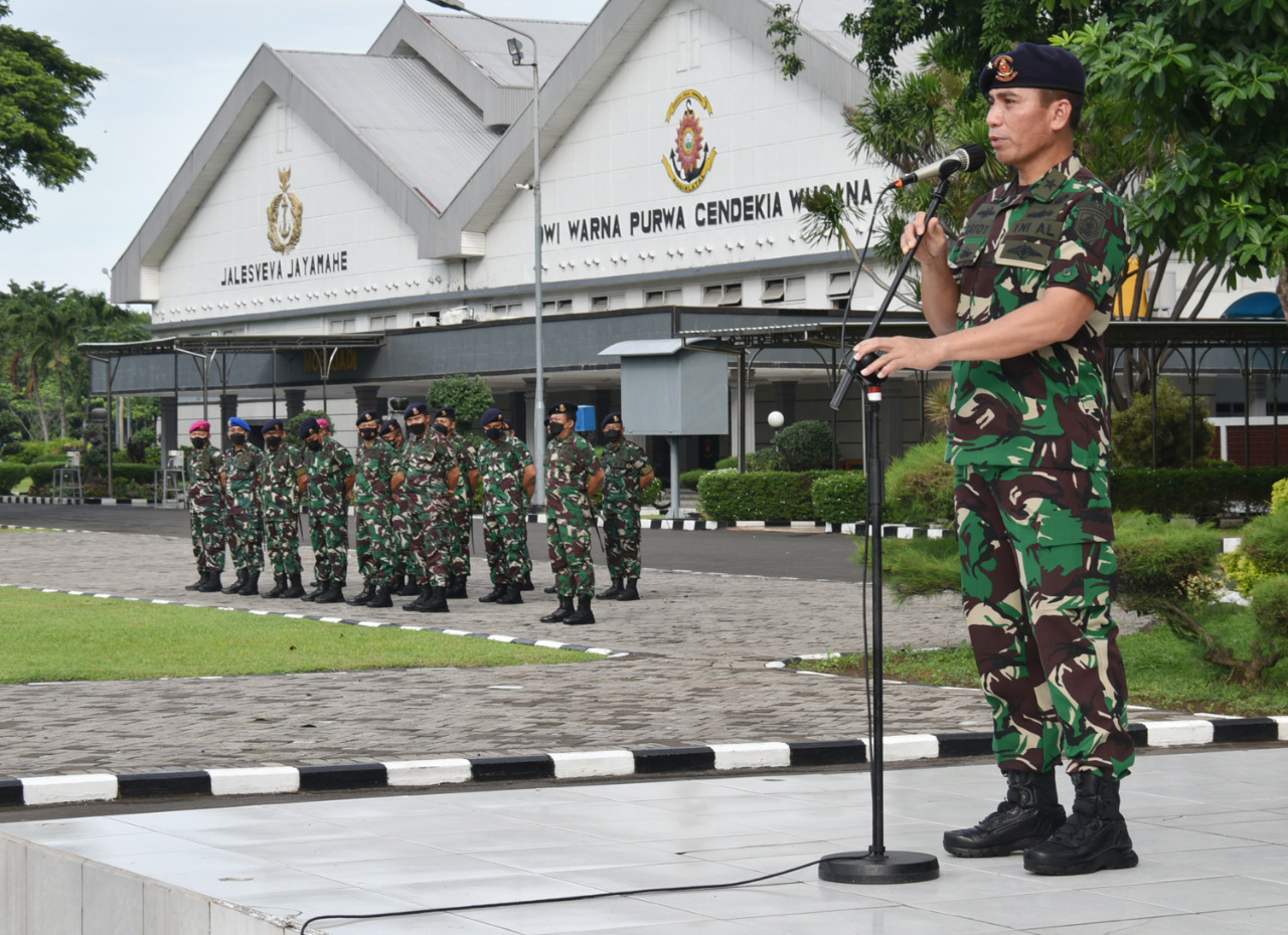 Brilian°Surabaya, Direktur Umum Komando Pembinaan Doktrin Pendidikan dan Latihan TNI AL (Dirum Kodiklatal) Laksma TNI Gatot Hariyanto memimpin Apel Gabungan yang diikuti Prajurit dan Pegawai Negeri Sipil (PNS) Kodiklatal. Adapun Apel Gabungan tersebut dilaksanakan di lapangan Laut Maluku Kesatrian Kodiklatal Bumimoro Surabaya, Rabu, (8/12/2021).