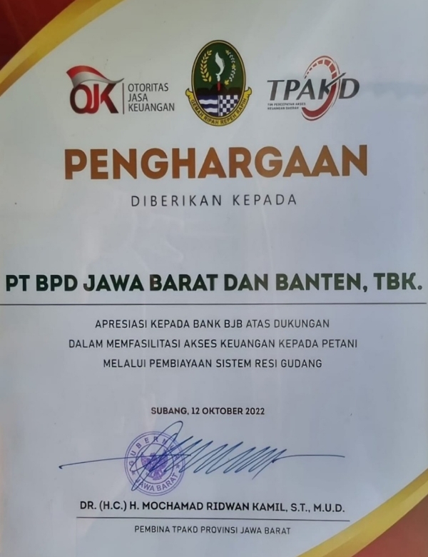 Brilian•SUBANG – bank bjb meraih penghargaan dari Gubernur Jawa Barat Ridwan Kamil selaku Pembina Tim Percepatan Akses Keuangan Daerah (TPAKD) Jawa Barat atas dukungan dalam memfasilitasi akses keuangan kepada petani melalui pembiayaan sistem resi gudang.