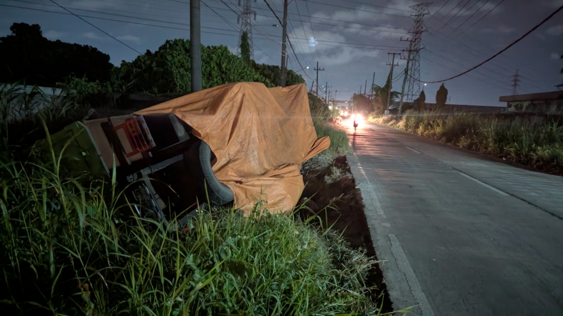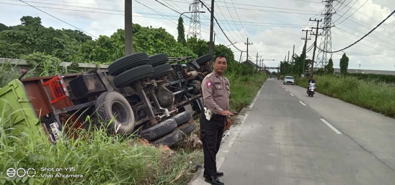 “Sewaktu truk Fuso dengan muatan besi lonjor tersebut berjalan dari utara ke selatan, sesampai di lokasi kejadian berpapasan dengan kendaraan truk dari arah sebaliknya. Saat berpapasan, ban truk sebelah kiri keluar badan jalan dan langsung terguling ke arah timur masuk ke parit,” ungkap pihak kepolisian dalam laporannya.