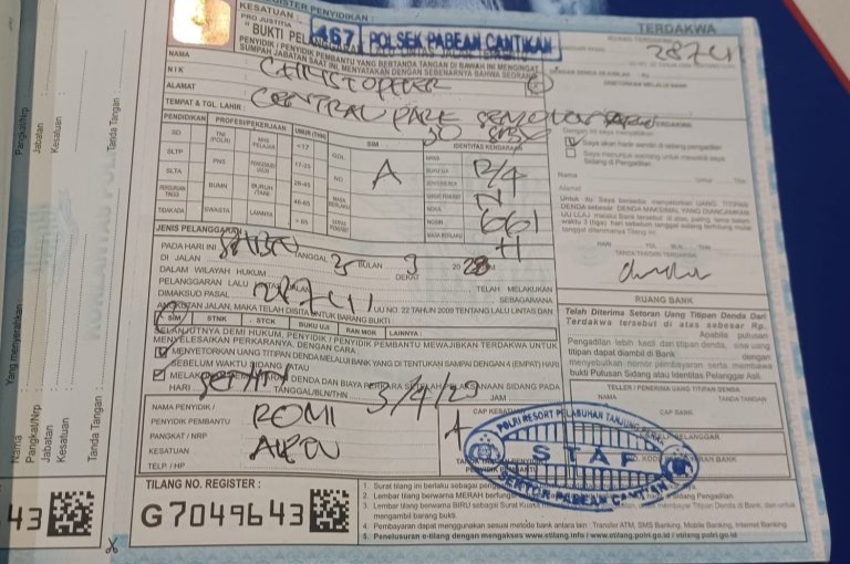 “Memang saat itu pengendara tersebut menitipkan sejumlah uang, karena berdasarkan pasal 25 ayat (3) PP 80/2012 pelanggar bisa menitipkan uang denda karena tidak bisa menghadiri persidangan,” jelas Aiptu Romy.