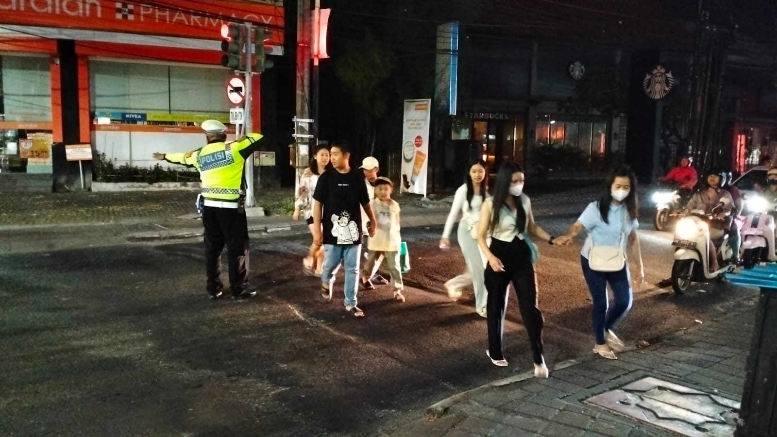 Ketika arus Lalu Lintas padat ada pemandangan menarik, terlihat Personil Lalu Lintas Polsek Kuta Utara membatu wisatawan yang kesulitan menyebrang jalan di simpang Lio Square Kelurahan Kerobokan Kelod, Kecamatan Kuta Utara, Kabupaten Badung. Minggu (17/9) malam.