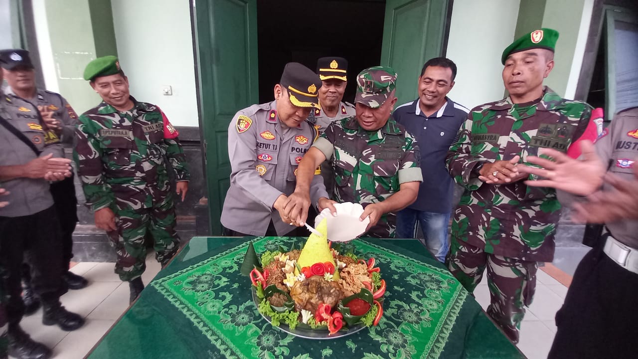 “Selamat Ulang Tahun Semoga TNI semakin jaya dan dicintai masyarakat”, ucap Kapolsek Mengwi kepada Danramil sambil menyerahkan nasi tumpeng.