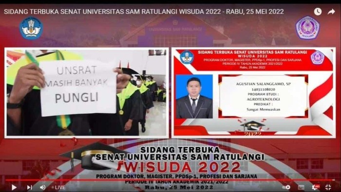 Brilian°Manado – Momen wisuda biasanya dirayakan dengan foto bersama atau syukuran bersama teman dan keluarga. Namun seorang wisudawan Universitas Sam Ratulangi (Unsrat) Manado, Sulawesi Utara (Sulut) menjadikan momen wisudanya untuk mengirimkan pesan bahwa Unsrat marak pungutan liar alias pungli.