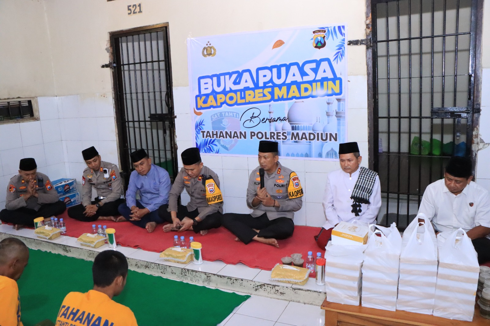 Brilian-news.id | MADIUN – Kapolres Madiun, AKBP Mohammad Zainur Rofik, S.I.K. didampingi oleh Pejabat Utama Polres Madiun, melaksanakan kegiatan buka puasa bersama dengan para tahanan di Rumah Tahanan (Rutan) Polres Madiun pada Sabtu, 8 Maret 2025.