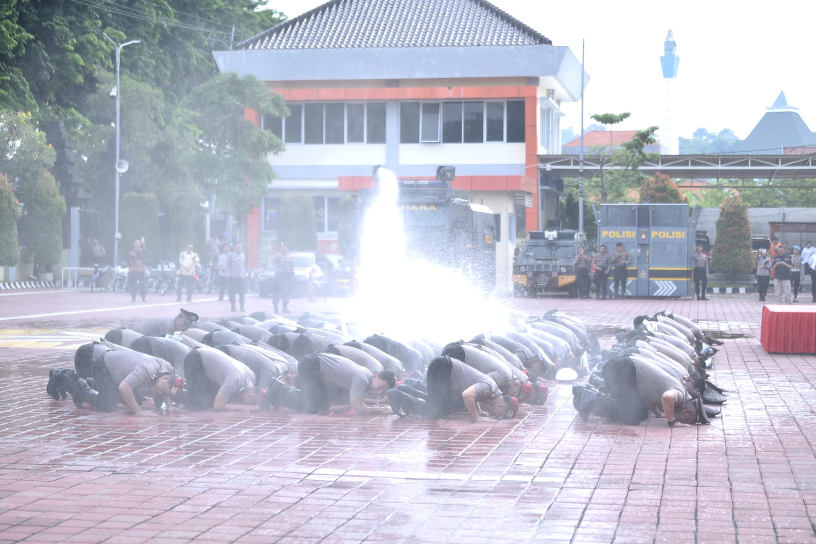 Usai upacara, kegiatan dilanjutkan dengan tradisi penyiraman air bunga sebagai simbol rasa syukur dan penyucian diri dalam mengemban tanggung jawab yang lebih besar. Kapolres Gresik didampingi para PJU secara langsung memberikan ucapan selamat kepada para personel yang naik pangkat, yang turut didampingi oleh istri atau suami masing-masing.
