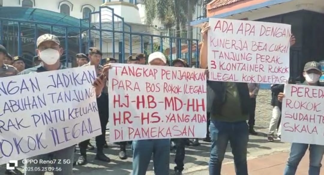 Brilian°Surabaya, – Masih dalam tahapan aksi demontrasi lanjutan yang digelar oleh Aliansi Madura Indonesia (AMI) ke kantor wilayah Beacukai Jatim 1 dan kantor beacukai pelabuhan Tanjung Perak Surabaya, kini memasuki hari ke dua, hal ini lantaran untuk menyampaikan aspirasi terkait maraknya peredaran pabrik rokok ilegal yang banyak beredar di Madura dan Malang.