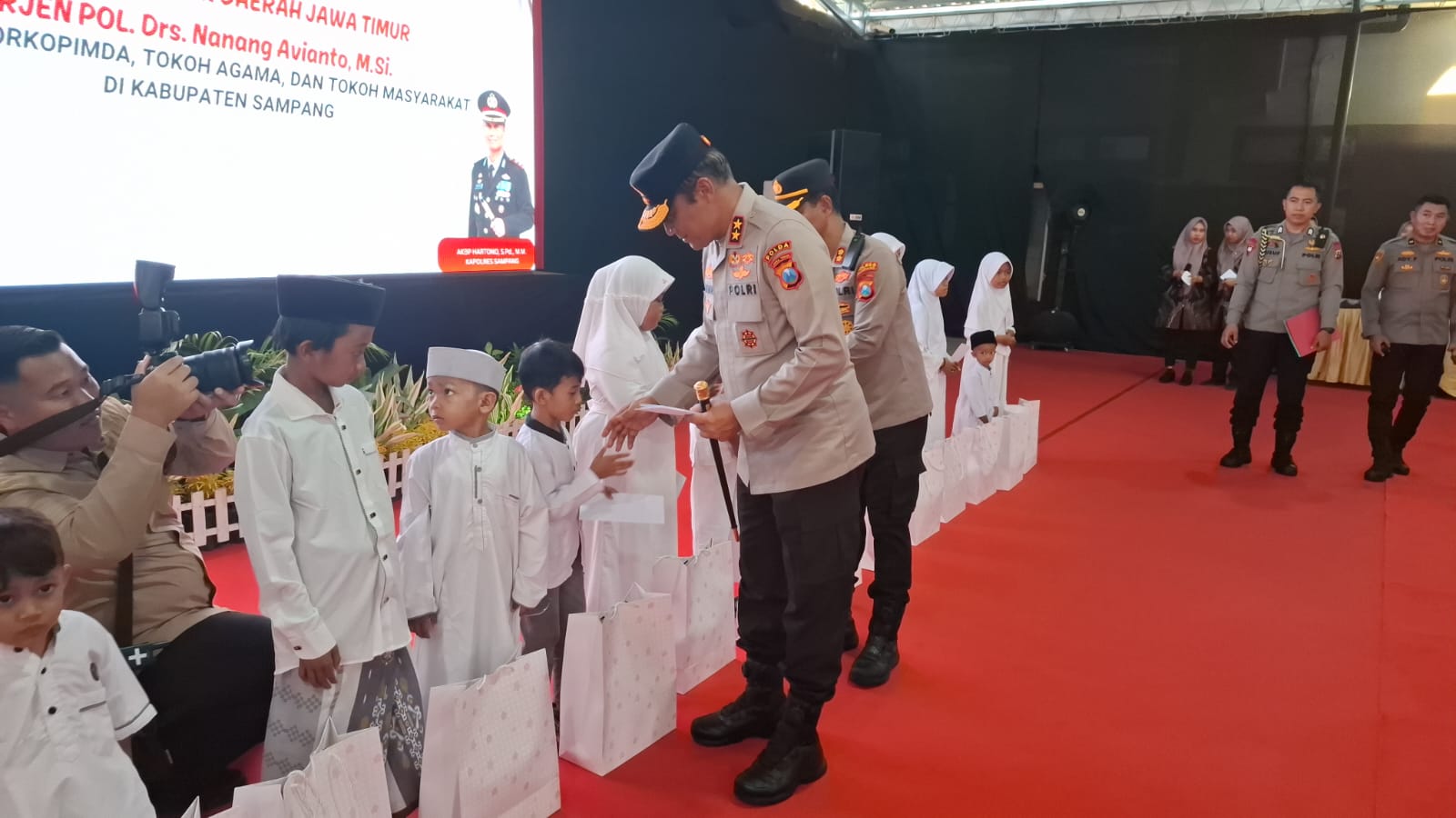 Sebelum melaksanakan silaturahmi, Kapolda Jatim didampingi Kapolres Sampang memberikan santunan kepada puluhan anak yatim.