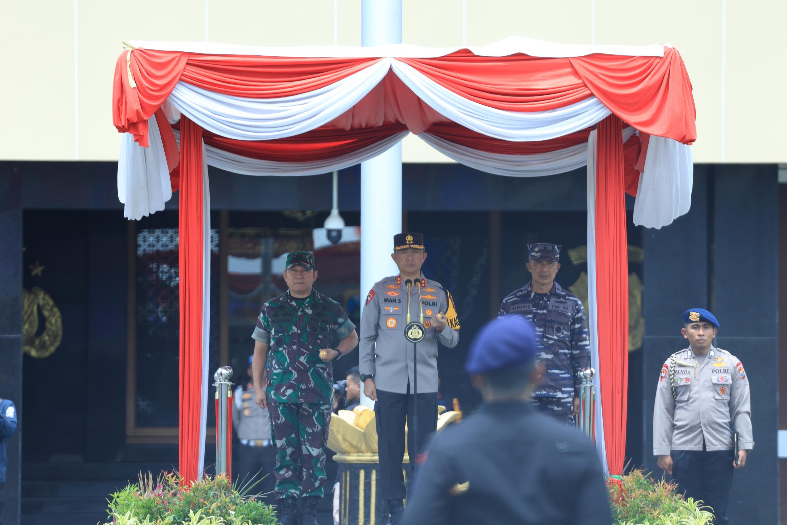 Kapolda Jatim Irjen Pol Drs Imam Sugianto M.Si, yang didamping Pangdam V Brawijaya Mayjen TNI Rafael Granada Baay dan Kepala Staf Koarmada ( Kaskoarmada II ) Laksamana Pertama TNI Isswarto, memimpin kegiatan tersebut.