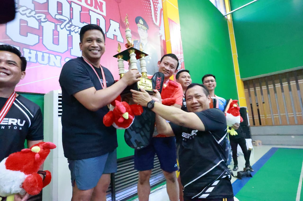 Kapolda Jatim Irjen Pol Dr Toni Harmanto, secara simbolis memberikan piala serta medali kepada Kapolres Bondowoso dan Kasubbag Dumasan Itwasda, yang keluar sebagai pemenang pada Badminton Kapolda Cup 2023.