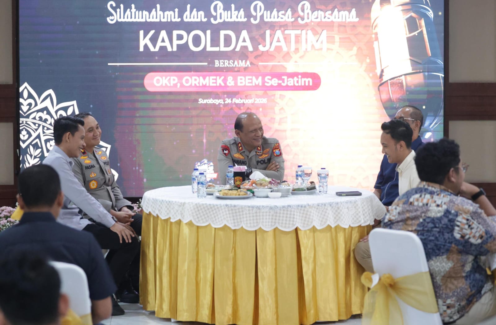 Brilian-news.id | SURABAYA – Kapolda Jawa Timur, Irjen Pol Drs.Nanang Avianto, M.Si silaturahmi dan buka puasa bersama Badan Eksekutif Mahasiswa (BEM), Organisasi Mahasiswa Ekstra Kampus (Ormek) serta Organisasi Kemasyarakatan Pemuda (OKP) se-Jawa Timur di Selasar Gedung Patuh Mapolda Jatim, Selasa (23/2/2026).
