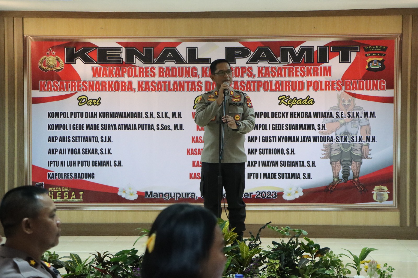 Acara Kenal Pamit Pejabat Utama Polres Badung yakni Wakapolres, Kabagops, Kasat Reskrim, Kasat Resnarkoba, Kasat Lantas dan Kasatpolairud Polres Badung dilaksanakan dengan suasana penuh kekeluargaan tersebut dihadiri oleh Ketua Bhayangkari Cab. Badung Ny. Levi Teguh Priyo, PJU Polres Badung, Pejabat Lama dan Baru, Para Kapolsek jajaran, Perwira, Bintara dan ASN Polres Badung.