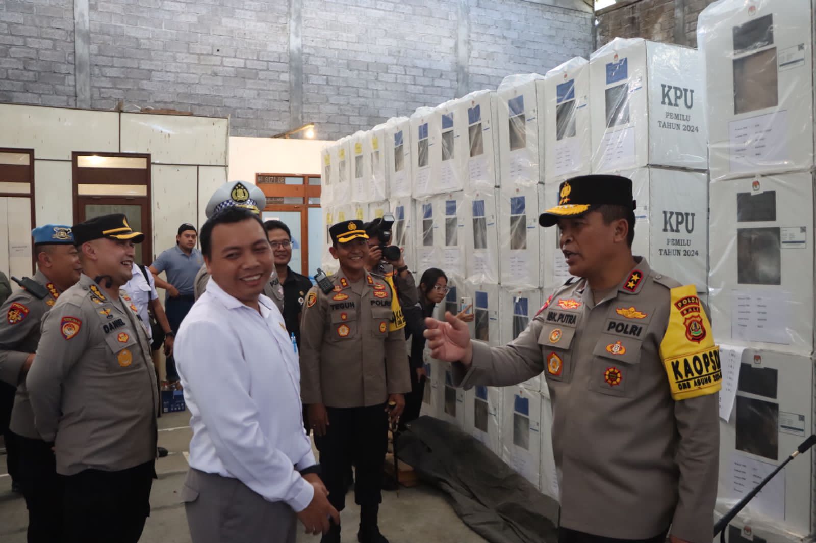 Brilian-news.id | BALI – Kepala Kepolisian Resor Badung AKBP Teguh Priyo Wasono, SIK didampingi Wakapolres Kompol I Made Pramasetia, SH, SIK, MH, Komisioner KPU Badung, PJU Polres Badung, Staf Bawaslu Badung, sambut kunjungan kerja Kapolda Bali Irjen. Pol. Ida Bagus Kade Putra Narendra, S.I.K., M.Si di Gudang Penyimpanan Logistik KPU Kab. Badung, Jalan Gatot Subroto Barat 400X Denpasar Utara, Kota Denpasar, Bali. Senin, (5/2/2024) Sore pukul 15.28 WITA.