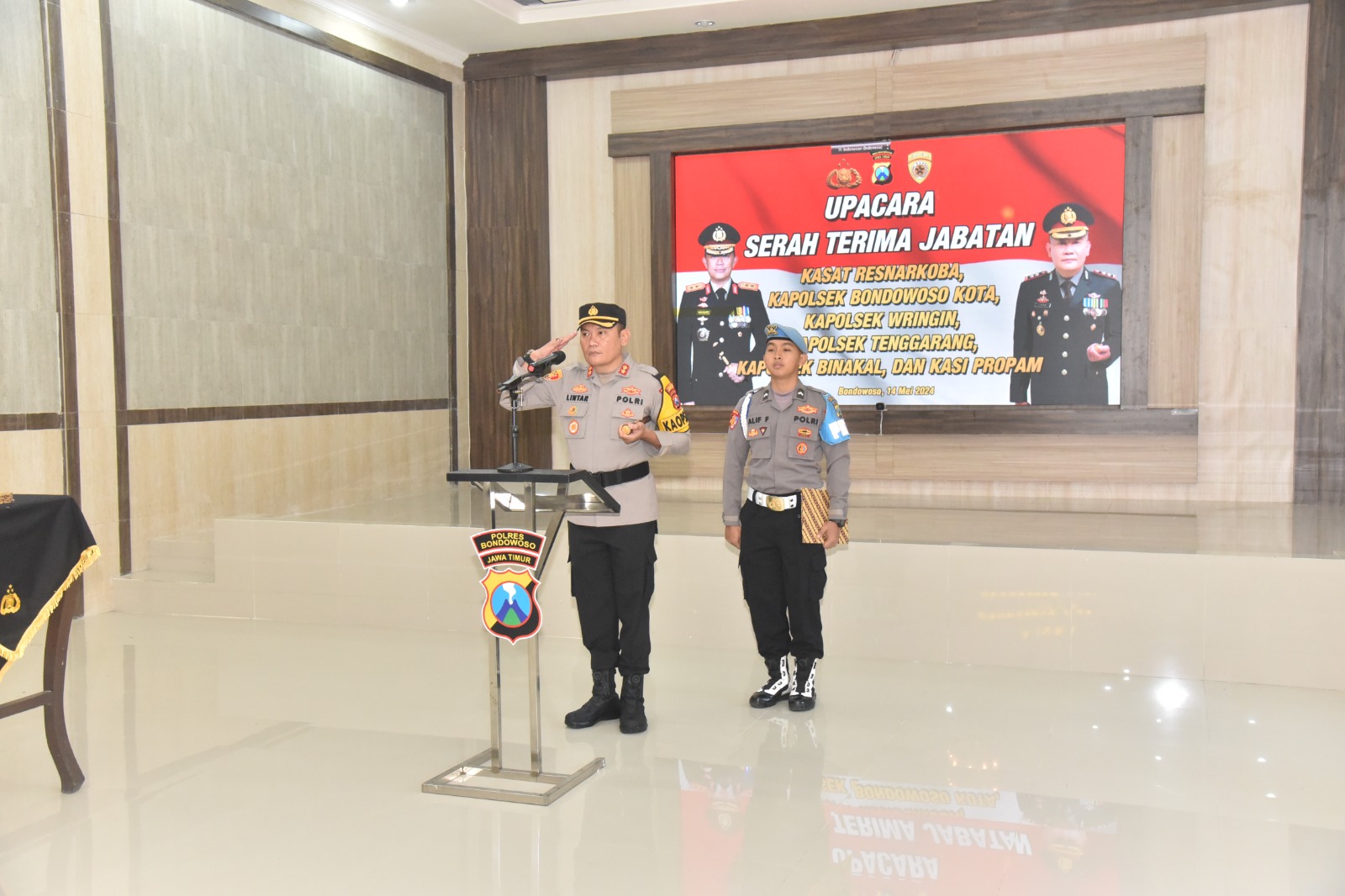 Brilian-news.id | BONDOWOSO – Kapolres Bondowoso AKBP Lintar Mahardhono, SH. S.I.K. M.I.K. memimpin upacara serah terima jabatan (sertijab) 5 Pejabat dilingkup Polres Bondowoso, Selasa 14/05 2024.