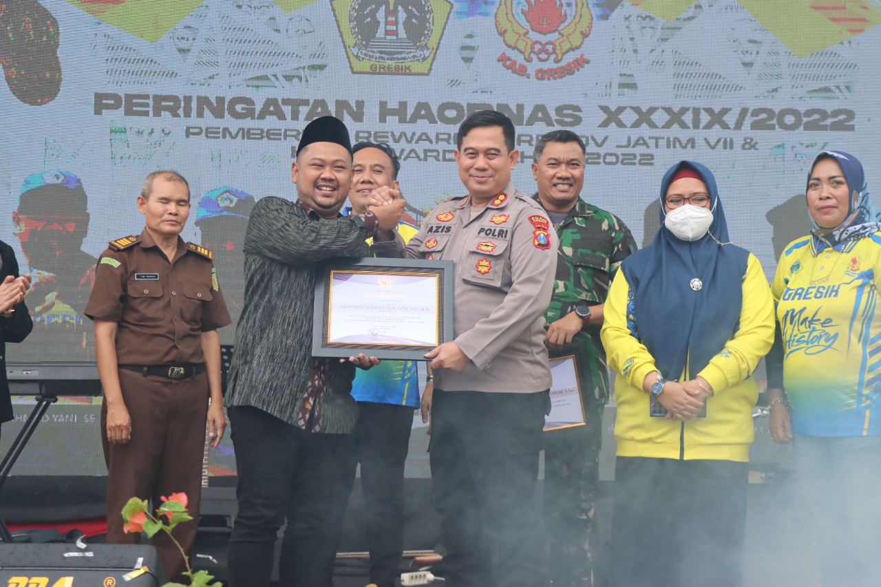 Penghargaan kontribusi dan peduli olahraga institusi atau aparat Kabupaten Gresik, diberikan kepada Kapolres Gresik AKBP Mochammad Nur Aziz dan Dandim 0817 Gresik Letkol Inf. Ahmad Saleh Rahanar.