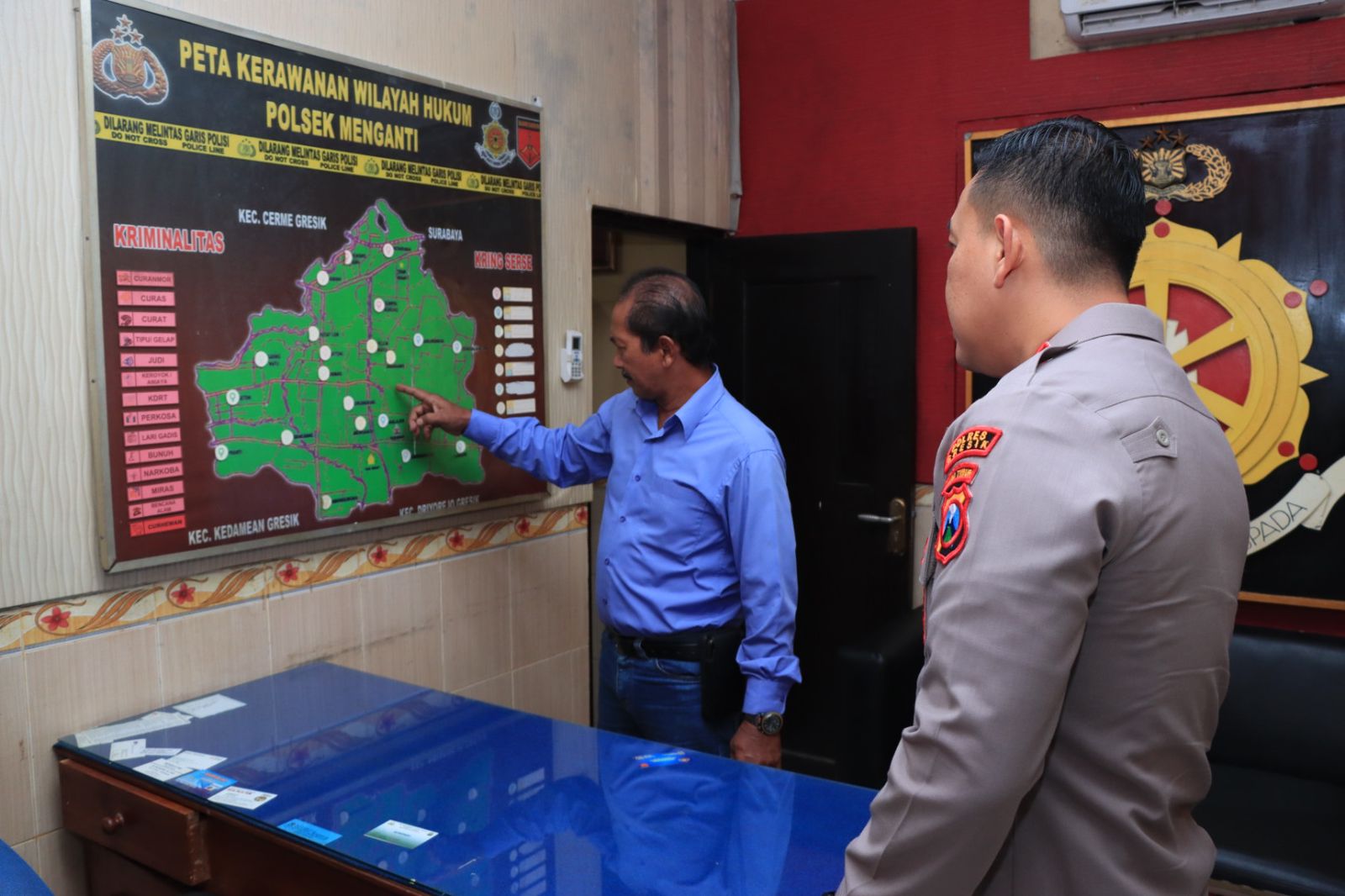 Pukul 10.30 sampai di Polsek Menganti, Selanjutnya Kapolres Gresik AKBP Aditya Panji Anom dan PJU Polres Gresik di terima kanit lantas Iptu Tasmani dan anggota Polsek, kemudian rombongan Kapolres dan PJU melakukan pengecekan ke masing-masing ruang kerja anggota mulai dari ruang SPKT, ruang reskrim, ruang kasium, ruang tahanan, ruang santai, ruangan lantas, halaman belakang, ruang Bhayangkari, Ruang Intel/Yan SKCK.