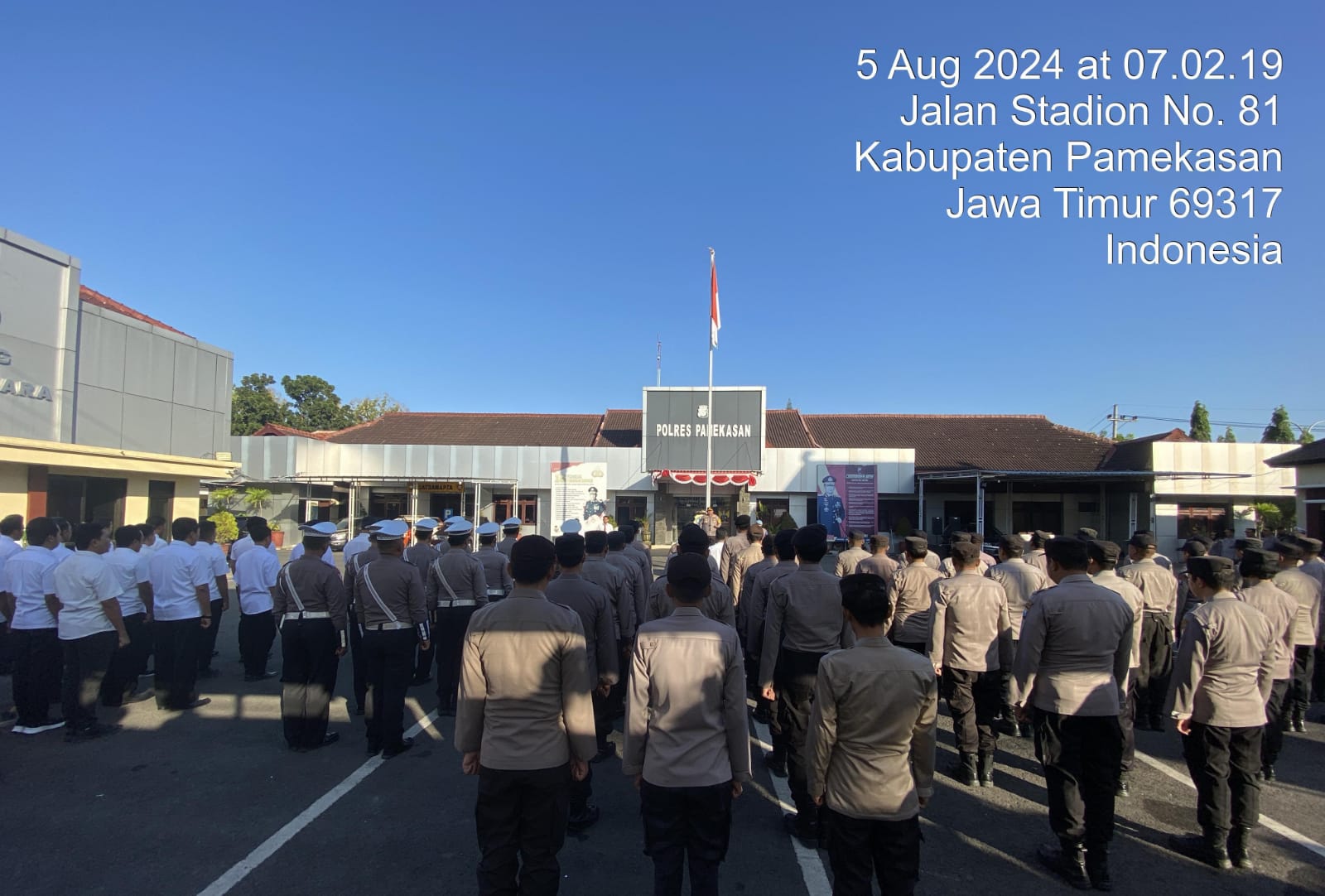 Brilian-news.id | PAMEKASAN – Kapolres Pamekasan AKBP Jazuli Dani Iriawan, S.I.K., M.Tr.Opsla. memimpin apel pagi jam Pimpinan yang diikuti Pejabat Utama, Kapolsek Jajaran, Perwira Staf dan anggota Polres, perwakilan anggota Polsek dan ASN, Senin (5/8/2024).