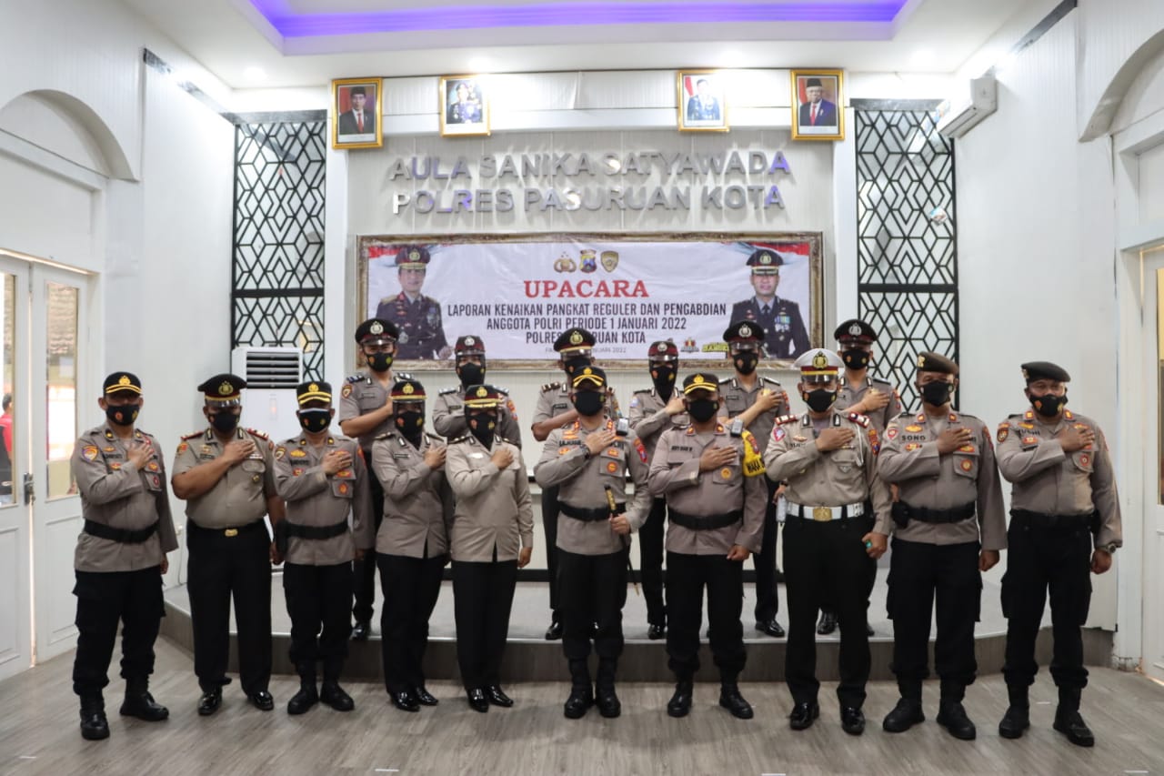 Brilian°Pasuruan – Kapolres Pasuruan Kota AKBP Raden Muhammad Jauhari S,H.,S.I.K.M.S.i. memimpin Upacara Korp Raport kenaikan Pangkat Anggota Polri Polres Pasuruan Kota Periode 1 Januari 2022 melalui Virtual Polda Jatim di Rupatama Sanika Satyawada Polres Pasuruan Kota Jl. Gajah Mada No. 19 Kota Pasuruan. Senin (3/1/2022).