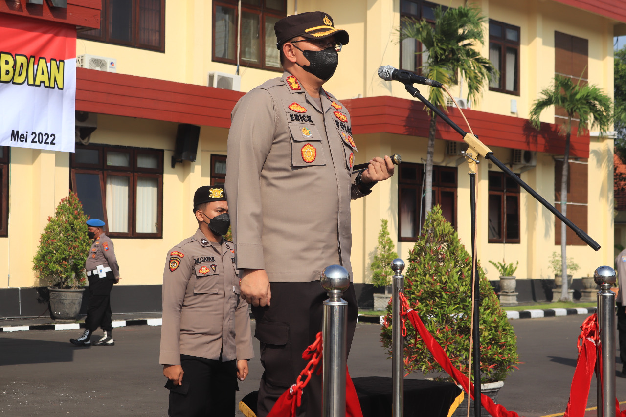 Brilian°PASURUAN – Kapolres Pasuruan AKBP Erick Frendriz, S.I.K., M.Si memimpin langsung pelaksanaan Upacara Kenaikan Pangkat Pengabdian Anggota Polres Pasuruan dari AIPTU Ke IPDA TMT 01 Mei 2022, bertempat di Lapangan Apel Sarja Arya Racana Polres Pasuruan, Selasa (17/5/2022).