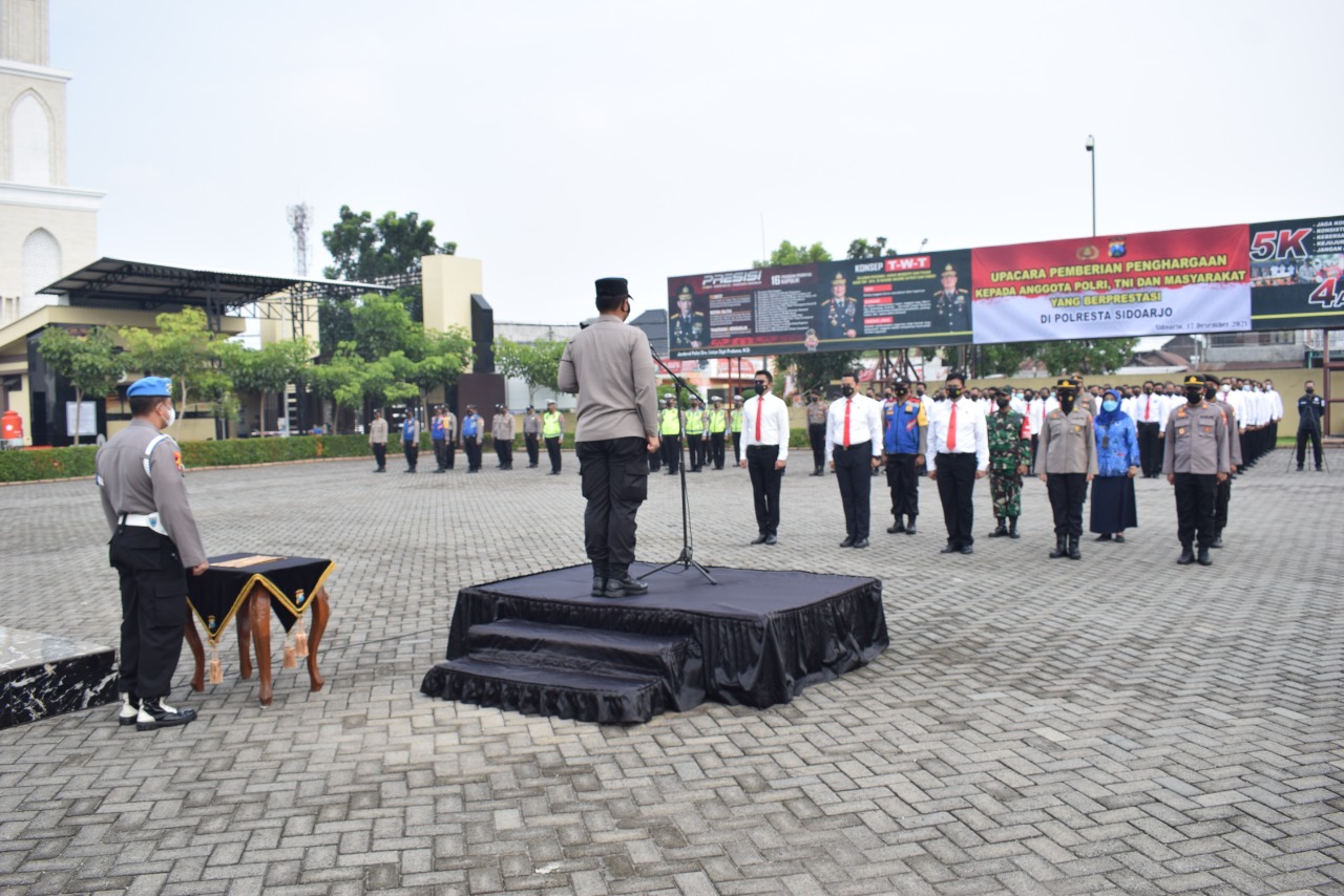 Penghargaan diberikan dalam apel di Mapolresta Sidoarjo, Jumat (17/12/2021)pagi. “Penghargaan ini sebagai bentuk apresiasi kepada anggota berprestasi dan masyarakat yang telah membantu tugas kepolisian di wilayah hukum Polresta Sidoarjo, khususnya dalam penanganan Covid-19,” ujar Kapolresta Sidoarjo Kombes Pol. Kusumo Wahyu Bintoro.