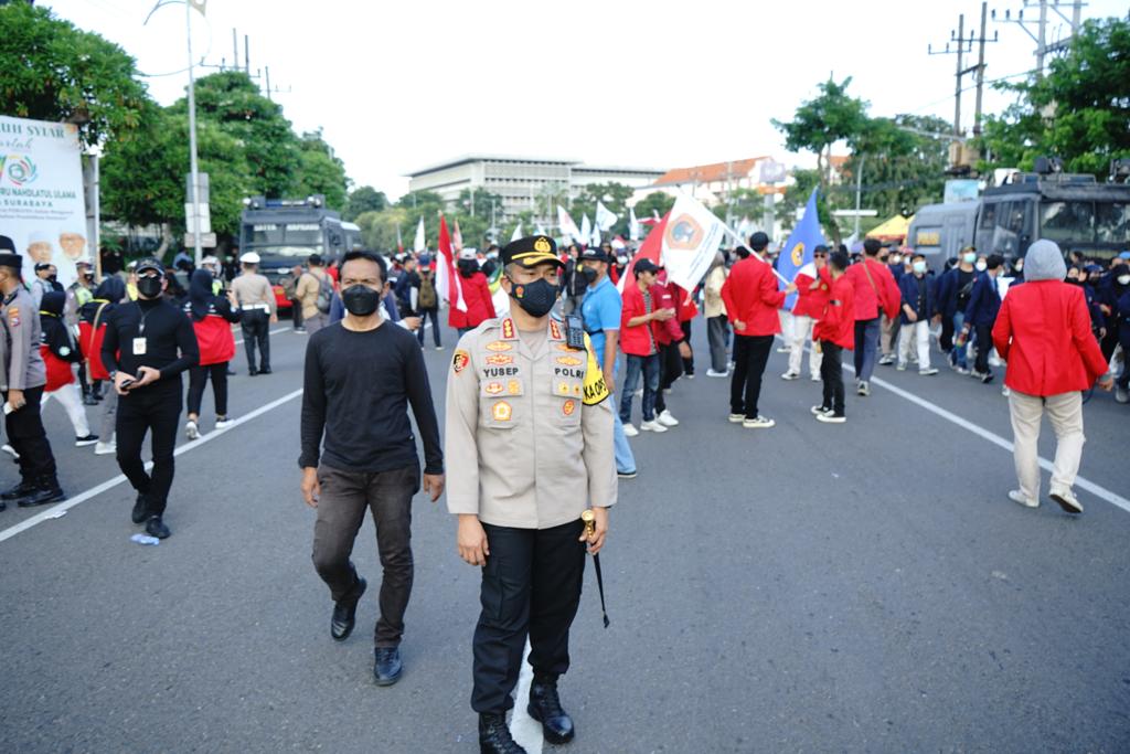 “Kami berupaya maksimal mengawal dan menjaga adik-adik mahasiswa untuk menyampaikan aspirasinya. Harapannya tentu aspirasi dapat tersampaikan dengan tertib dan santun,” jelas mantan Dirkrimsus Polda Jatim ini.