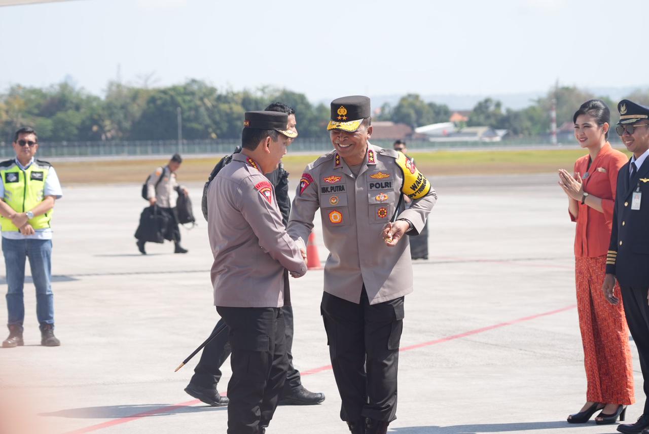 Kedatangan Kapolri dan Panglima TNI disambut oleh Kapolda Bali, Irjen Pol. Ida Bagus Kade Narendra, S.I.K., M.Si. bersama Pangdam IX Udayana, Mayjen TNI Harfendi, S.I.P, M.Sc. di Bandara Internasional I Gusti Ngurah Rai, Minggu (8/10/2023).