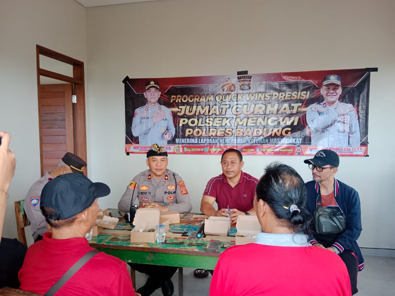 “Kami dari polsek mengwi secara rutin melaksanakan kegiatan Jumat Curhat untuk mendengarkan langsung keluhan masyarakat”, ucapnya.
