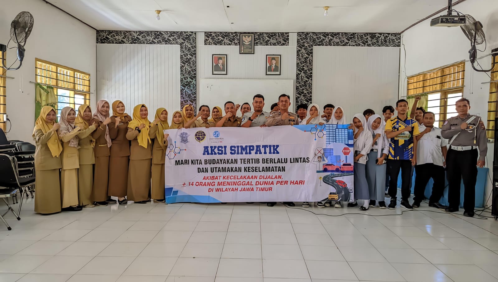 Mapolres Sampang AKBP Hartono melalui Kasatlantas AKP Sigit Ekan Sahudi, Melaksanakan kegiatan aksi simpatik dan sosialisasi keselamatan berlalulintas bersama Jasa Raharja Cab.Sampang kepada Guru dan pelajar SMK Negeri 1 Jrengik.