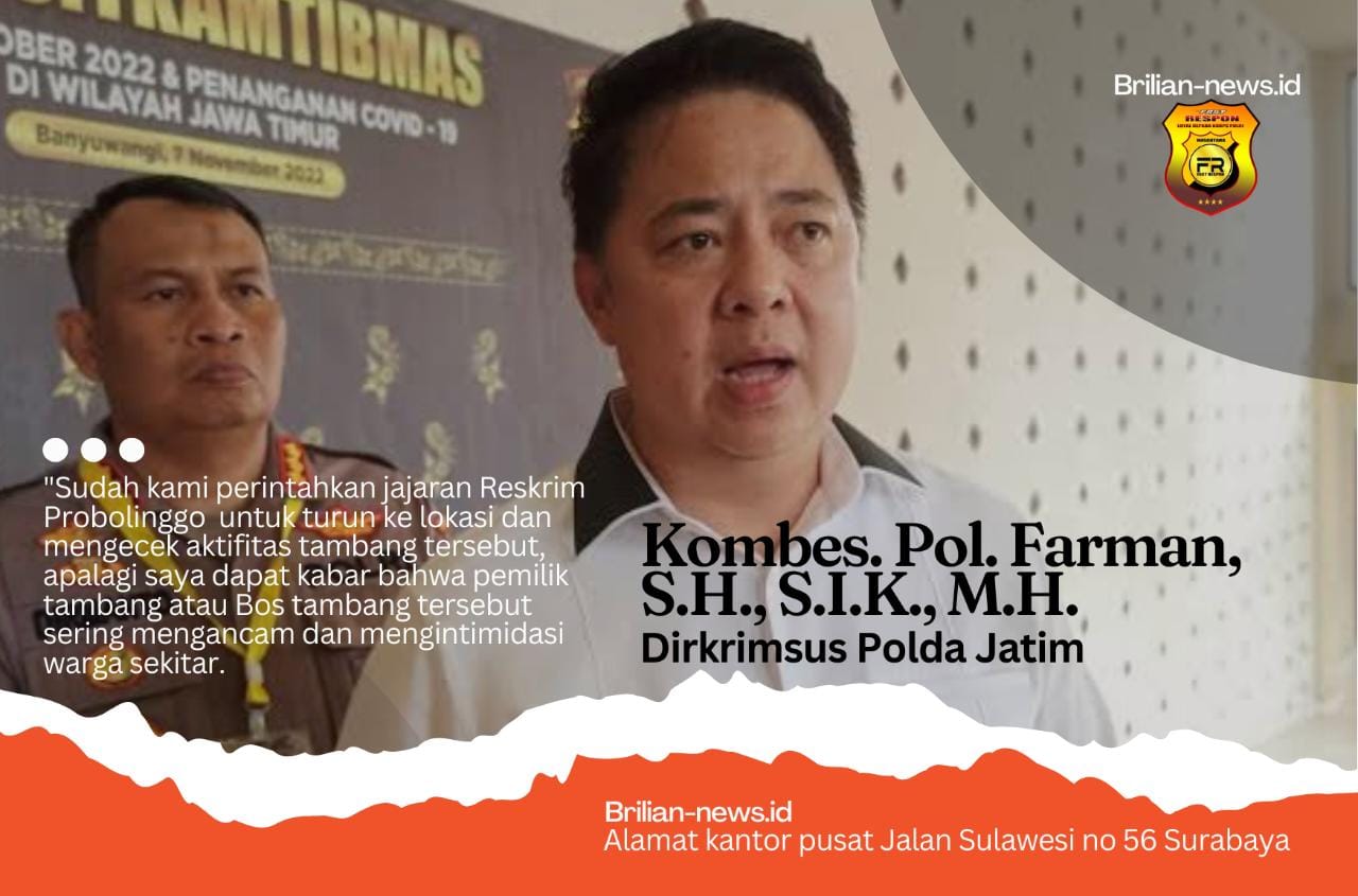 “Sudah kami perintahkan jajaran Reskrim Polres Probolinggo untuk turun ke lokasi dan mengecek aktifitas tambang tersebut, apalagi saya dapat kabar bahwa pemilik tambang atau Bos tambang tersebut sering mengancam dan mengintimidasi warga sekitar.