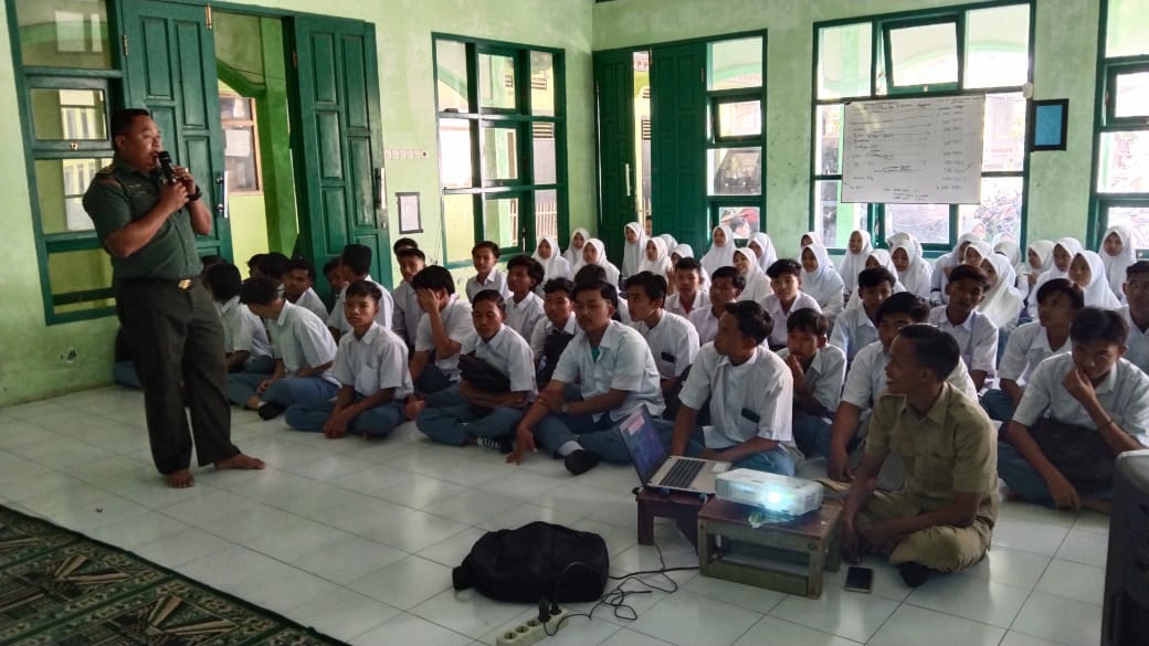 Brilian°Probolinggo – Sejumlah anak didik baru yang menempuh pendidikan SMK NU Bantaran Kecamatan Bantaran Kabupaten Probolinggo dalam masa pengenalan lingkungan sekolah menerima materi wawasan kebangsaan yang diberikan oleh Koramil 0820/04 Bantaran.