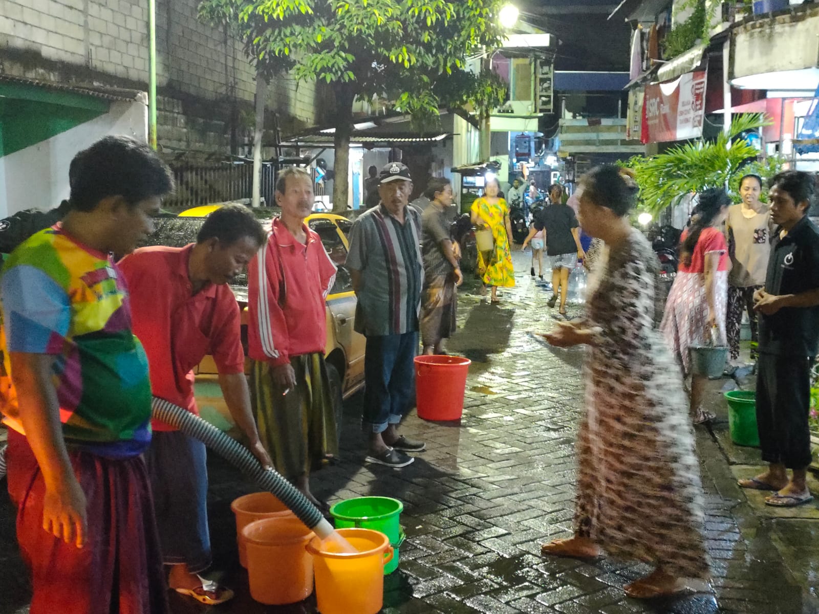 Brilian°Surabaya – Warga Surabaya yang berada di Gundi Lapangan kelurahan Gundi Kecamatan Bubutan saat ini rela mengorbankan waktu istirahatnya di malam hari, dikarenakan harus mengantri hanya demi mendapatkan air bersih yang dikirim oleh mobil tangki PDAM.