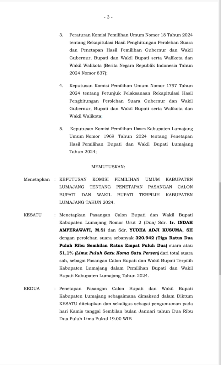 Brilian-news.id | LUMAJANG – Ketua Komisi Pemilihan Umum Kabupaten Lumajang, Penetapan Paslon Bupati dan Wakil Bupati Terpilih Kabupaten Lumajang Tahun 2024. Keputusan Komisi Pemilihan Umum Kabupaten Lumajang, Nomor 09 tahun 2025. Tentang Penetapan Pasangan Calon Bupati dan Wakil Bupati Terpilih Kabupaten Lumajang Tahun 2024. Jumat (10/01/2025). Berikut SK Penetapan Paslon Bupati dan Wakil Bupati Terpilih Kabupaten Lumajang Tahun 2024.