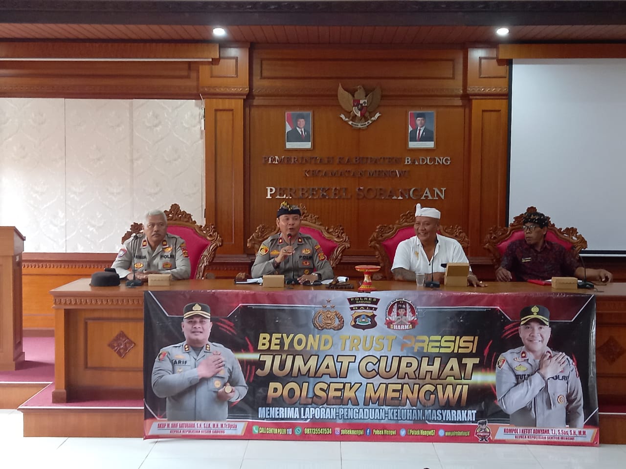 Kompol I Ketut Adnyana T.J dalam sambutan nya menyampaikan kegiatan Jumat Curhat yang dilaksanakan oleh Polsek Mengwi ini bertujuan untuk mendengarkan langsung keluhan kamtibmas yang terjadi dilingkungan nya masing-masing.