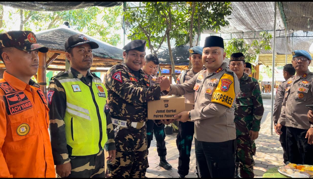 Kegiatan dilanjutkan dengan pemberian tali asih oleh Kapolres Pasuruan kepada Masyarakat dan anggota Banser berupa Paket Sembako, selanjutnya kegiatan Jum’at Curhat ditutup dengan Doa Bersama.