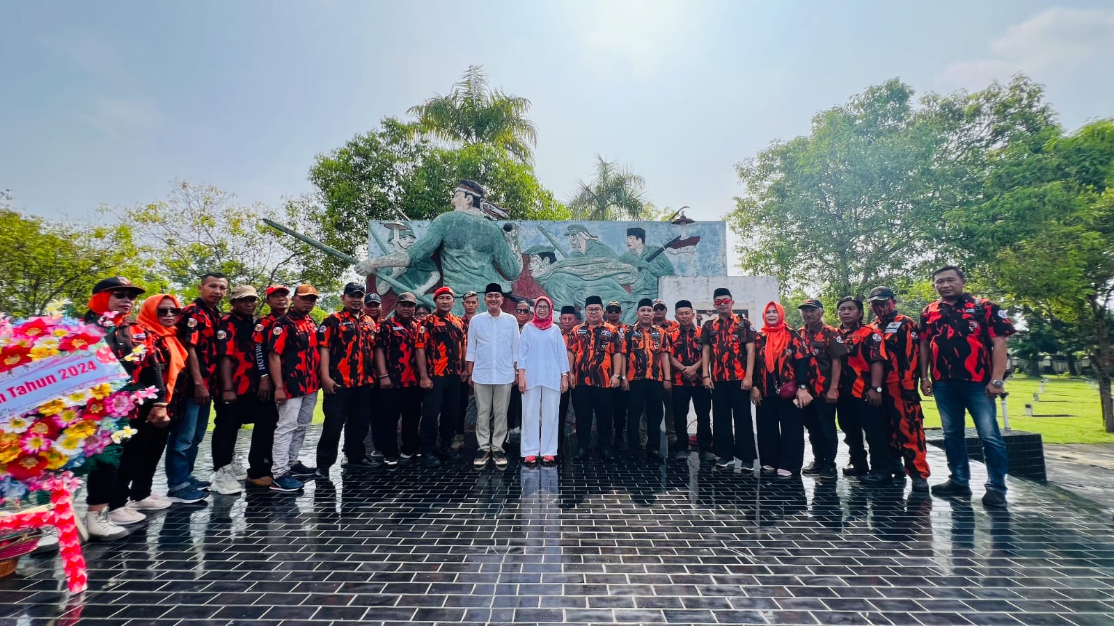 Didampingi Agus Setiawan (Samco) Ketua Pemuda Pancasila Lumajang dan sejumlah anggota, kader partai politik pendukung, Bunda Indah dan Mas Yudha menaburkan bunga sembari melantunkan doa pada pahlawan kemerdekaan.