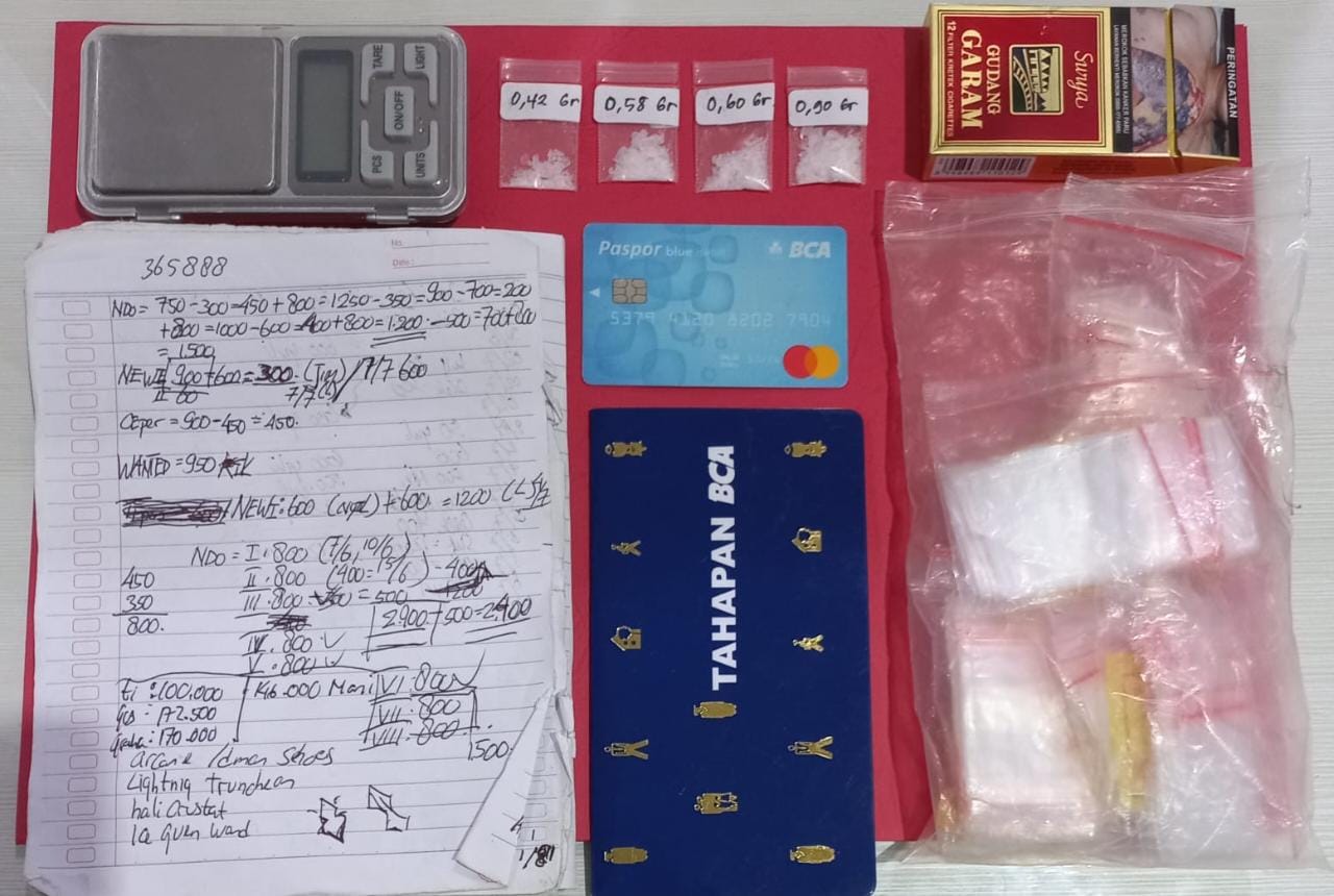 “JK mengaku bahwa mendapatkan barang bukti berupa 4 (empat) bungkus plastic klip berisi Kristal putih yang diduga narkotika jenis sabu dengan berat kotor total yaitu + 2,5 dua koma lima gram serta bungkusnya yang manamm awalnya sebanyak 5 (lima) gram tersebut didapkatkan dari TD yang saat ini dalam pengejaran”, ungkap Satnarkoba.